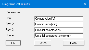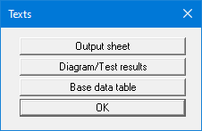 If the "Diagram/Test results" command button is clicked in the above box the following dialog box opens, allowing editing of the diagram axes labelling and the results table texts in the output sheet table: