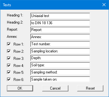 Your input in rows 1 to 6 of the above dialog box, as well as the input for "Report:" and "Annex:" also represent the designations for the input boxes in the "Edit/General" menu item dialog box. If rows are deactivated in the above dialog box, the corresponding input boxes in the "Edit/General" menu item dialog box are also deactivated.