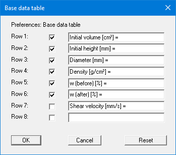 If the "Base data table" button is clicked in the above option box the following dialog box opens, allowing editing of the base data input box labelling and the display of the test data in the output sheet table: