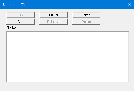 Create a list of files for printing using "Add" and selecting the desired files. The number of files is displayed in the dialog box header. Using "Delete" you can mark and delete selected individual files from the list. After selecting the "Delete all" button, you can compile a new list. Selection of the desired printer and printer preferences is achieved by pressing the "Printer" button.
