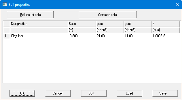 Select the menu item "Edit/Soils" and enter the soil properties: