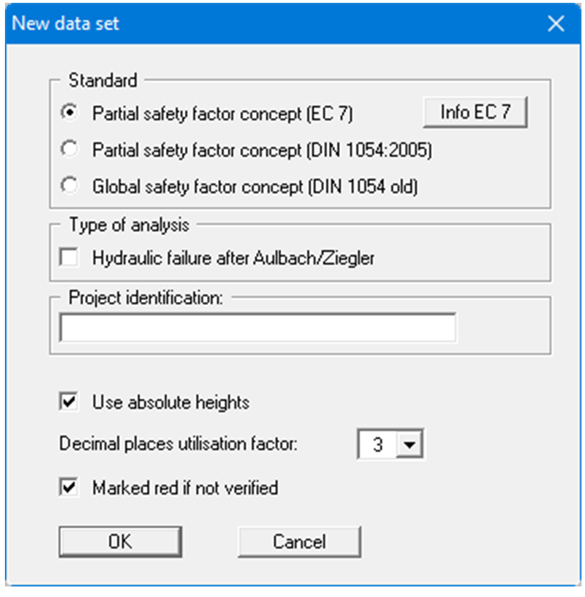 In the first group box the radio buttons are used to specify which safety concept to use for analysis. The hydraulic heave analysis after Aulbach/Ziegler can be activated below this.