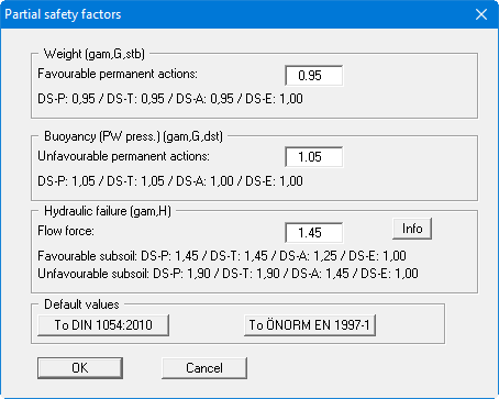 If you press the "Info" button, you will see further information on the subsoil situation (favourable/unfavourable). In the "Default values" group box the partial factors for the various load cases and subsoil conditions given in the DIN 1054:2010 and in the EC 7 can be selected by means of the dialog box reached by clicking the "To DIN 1054:2010" button. The load case designations were altered for the EC 7 partial safety factor concept: