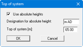 Using this menu item you can activate absolute elevations (e.g. m AD). Activate the check box and enter the new height for top of system (= excavation base). The designation for the absolute elevation, which you enter before, is shown in the soil properties legend as the depth dimension.