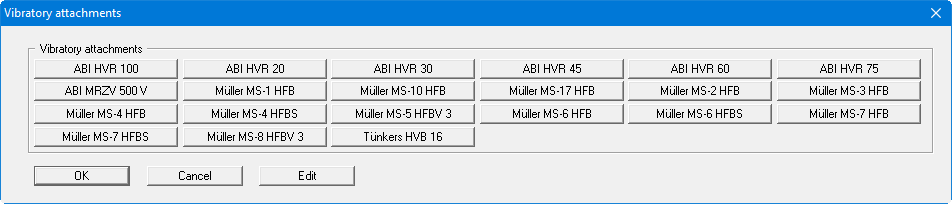 The data for the existing appliances can be edited or new appliances added by pressing the "Edit" button. The following dialog box for vibrating pile drivers (vibratory attachments) opens:
