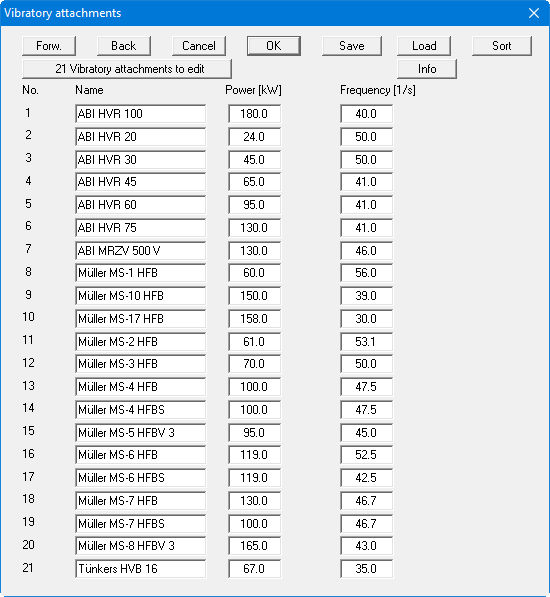 New equipment can be added by clicking the "x Vibratory attachments to edit" button. Enter the required number and then edit the equipment name and the data in the newly added rows. If there are more than 25 rows, navigate between the boxes using "Forw." and "Back".