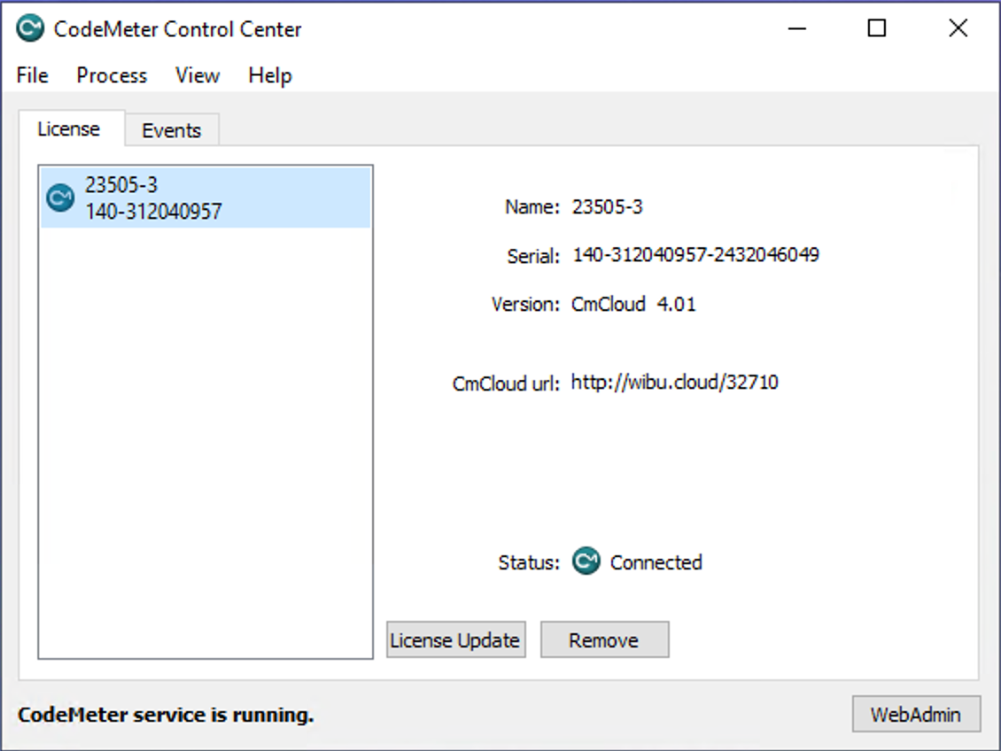 To mirror your CmCloudContainer, you have received the CodeMeter "Credential" file (e.g., 140-312040957.wbc) from us by email. Drag and drop this file onto the window of the CodeMeter Control Center.