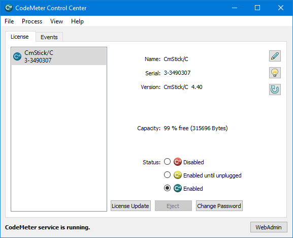 The following program window will open, showing you information about your CmStick, among others name, serial number and version of the firmware. The firmware is a programming directly on your CmStick for which updates can be retrieved from the server of the manufacturer WIBU-Systems via the button with the circle arrow symbol.
