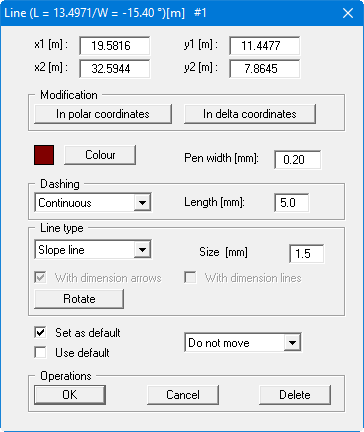 The example below shows the editor box for a line, in which you can edit the coordinates, colour, line strength, dashing and line type (e.g. dimension line, ground line, slope line, etc.). For lines, the length is shown in the blue title bar at the top of the dialog box, together with the angle of inclination. In addition, the current drawing layer is shown in the title bar by the '#1'. Using the "In polar coordinates" and "In delta coordinates" buttons you can define the coordinates of the line from a given origin.