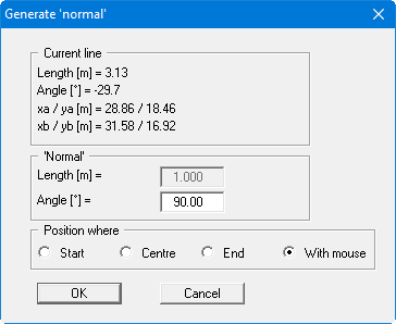 If the "Start", "Centre" or "End" are activated as the position in the lower group box, the length of the normal to be drawn must be given in the group box above this. Using the "Angle" input box lines can also be generated that are not classical normals at 90° to the selected line. If a negative angle value is given the line is drawn on the opposite side of the selected line.