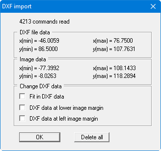 At the top of this box, you can see information on the dimensions of the DXF file and the image data for your current project. Normally, the DXF data are transferred with the correct coordinates. You should therefore deactivate the tick in the "Change DXF data" group box.