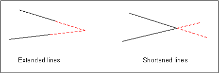 If "Both lines" is clicked, the lines are united, i.e. extended or shortened as shown in the sketch above. If "Line 1" or "Line 2" are selected, only the respective line is extended or shorted to the imaginary intersection. Where crossing lines need to be shortened, the shortest individual line ends will always be trimmed The line numbers refer to the sequence when clicking the lines.