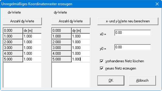 Mit den Knöpfen "Anzahl dx-Werte" und "Anzahl dy-Werte" können Sie die Rasteranzahl einstellen. Unter "dx" bzw. "dy" geben Sie dann die Rasterabstände vor. Wenn Sie den Knopf "x- und y- Werte neu berechnen" drücken, wird die erste Spalte links neben "dx" bzw. "dy" neu berechnet. Hier stehen die Absolutwerte des Rasters. Zur Ermittlung dieser Absolutwerte benutzt das Programm die Ursprungswerte des Rasters, die Sie über "x0" und "y0" festlegen.