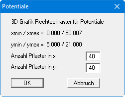 Bei unregelmäßigem Dreiecksnetz geht meist der 3D-Eindruck verloren. In diesen Fällen empfiehlt sich der Menüeintrag “Auswerten / 3D Raster". Nach Auswahl des gewünschten Parameters erhalten Sie die folgende Dialogbox, in der Sie das Raster festlegen können.