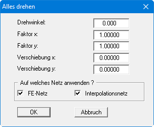 Die Koordinaten können über einen Faktor oder durch Verschiebung geändert werden. Dabei kann die Veränderung jeweils für x- und y-Koordinaten getrennt erfolgen. Auch eine Drehung des gesamten Systems über einen eingegebenen Drehwinkel ist möglich. Ist bereits ein Interpolationsnetz vorhanden, erscheint das untere Feld in der Dialogbox mit den Schaltern "FE-Netz" und "Interpolationsnetz", über die Sie die Anwendung auf das gewünschte Netz aktivieren.