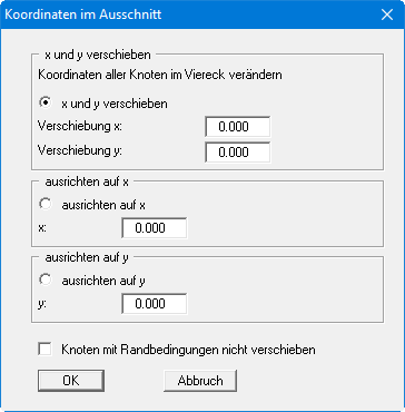 Sie können die Koordinaten für einen ausgewählten Bereich um einen festen Betrag in x- und y-Richtung verschieben. Dazu klicken Sie 4 Punkte im Gegenuhrzeigersinn mit der Maus an. In der folgenden Dialogbox können Sie dann die gewünschte Verschiebung eingeben. Alternativ können die Punkte auf einen bestimmten x- oder y-Wert ausgerichtet werden.
