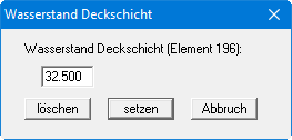 Sie geben den Wasserstand über der Deckschicht ein und weisen ihn durch Klicken auf den Knopf "setzen" dem gewählten Element zu. Alternativ können Sie so auch einen bereits vorhandenen Wasserstand verändern oder über den Knopf "löschen" entfernen.