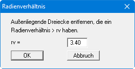 Das Programm berechnet zunächst das maximale Radienverhältnis des ungünstigsten Dreiecks und zeigt Ihnen die Werte in einer Infobox an. Danach erhalten Sie eine Dialogbox, in der Sie das Radienverhältnis vorgeben können, das veranlasst, dass Dreiecke mit höheren Werten gelöscht werden.