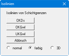 Mit den Schaltern "normal", "farbig" und "3D" legen Sie die Form der Isolinien fest. Details dazu sind in den Abschnitten Menüeintrag “Isolinien normal" bis Menüeintrag “3D" erläutert. Sie verlassen die Dialogbox, indem Sie den Knopf mit der Schicht klicken, deren Isolinienplan Sie darstellen möchten.