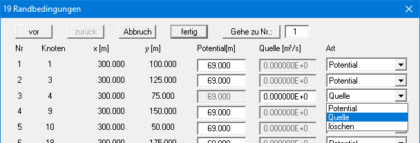 Sie können hier gleichzeitig an verschiedenen Knoten die Potentialwerte verändern, Potentiale in Quellen umwandeln oder Potentiale löschen. Die gewählten Änderungen werden durchgeführt, wenn Sie die Dialogbox mit "fertig" verlassen.