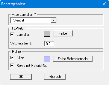 Wenn Sie unter "Rand / Rohre definieren" Rohre mit ihren Materialnummern festgelegt haben, können Sie über diesen Menüeintrag die Ergebnisse darstellen lassen. Zunächst erscheint eine Dialogbox, in der Sie zwischen der Darstellung von Potential, Gradient, Geschwindigkeit oder Wassermenge wählen können.