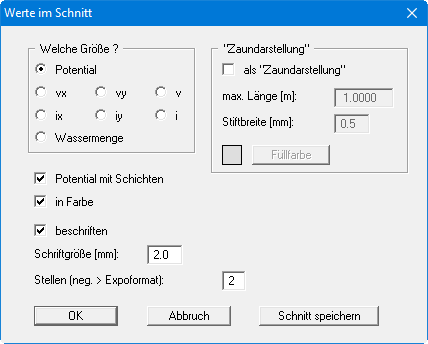 Entsprechend der gewählten Größe können Sie Einstellungen zur Schnittdarstellung, wie Beschriftung oder eine Zaundarstellung, treffen. Wenn Sie "Potential" gewählt haben, können Sie zusätzlich zum Potential auch die Schichten eintragen lassen.