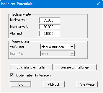 Es soll eine Isoliniengrafik der Potentiale erzeugt werden. Wählen Sie dazu den Menüeintrag "Auswerten / Isolinien normal" und in der folgenden Auswahlbox "Potentiale". Anschließend öffnet sich die folgende Dialogbox: