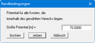 Geben Sie ein Potential von 70 m NHN ein und lassen Sie es für die ausgewählten Knoten übernehmen, indem Sie auf den Knopf "setzen" klicken. Umfahren Sie die neun FE-Knoten auf der rechten Seite des Systems und geben Sie ein Potential von 69 m NHN ein.