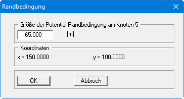 Wählen Sie den Menüeintrag "Rand / Potentiale einzeln" und in der Auswahlbox den Knopf "grafisch". Klicken Sie nun den Brunnen, also den Knoten 5 in der Mitte des Systems, an und geben Sie ein Potential von 65 m NHN ein.