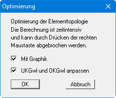 Grundsätzlich ist es günstig, vor einer Berechnung eine Optimierung der Elementtopologie vorzunehmen. Bei horizontal ebenen Systemen ergibt sich jedoch das Problem, dass durch die Verschiebung von einzelnen Knoten die Werte für UKGwl und OKGwl nicht an die neue Lage angepasst werden können. Falls im System unterschiedliche Werte für UKGwl und OKGwl vorliegen, erhalten Sie vom Programm vorab eine Warnmeldung.