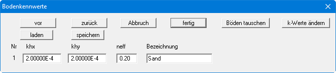 Bei der automatischen Generierung des FE-Netzes wurde allen Dreieckselementen die Bodennummer 1 zugewiesen. Daher enthält die Dialogbox auch nur eine Eingabezeile für einen Boden.