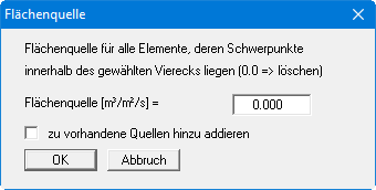 Sie können bestimmten Elementen Flächenquellen z.B. zur Berücksichtigung von Niederschlagsereignissen in einem bestimmten Gebiet zuweisen. Nachdem Sie den Bereich im Gegenuhrzeigersinn durch 4 Punkte als Polygon definiert haben, erhalten Sie die folgende Dialogbox: