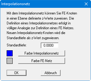 Grundsätzlich kann mit den vorangegangenen Menüeinträgen die vollständige Definition der z-Werte vorgenommen werden. Eine weitere Erleichterung bei der Definition bietet sich mit dem Interpolationsnetz an. Dieses Interpolationsnetz besteht, ähnlich wie das FE-Netz, aus Knoten und Dreiecken. An den Knoten können Sie bestimmte z-Werte vorgeben. Nach der Definition eines Interpolationsnetzes können Sie dem FE-Netz der von Ihnen ausgewählten Ebene diese z-Werte als Tiefen zuweisen. Die Zuweisung erfolgt durch lineare Interpolation. Das Interpolationsnetz sollte (muss aber nicht) das FE-Netz vollständig überdecken. Es kann im einfachsten Fall aus nur einem Dreieck bestehen.