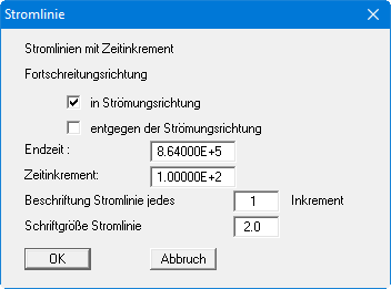 In der folgenden Dialogbox können Sie die Werte für die Berechnung und die Art der anschließenden Darstellung bestätigen oder verändern. Um den Weg eines Partikels rückzuverfolgen, aktivieren Sie den Schalter "entgegen der Strömungsrichtung".