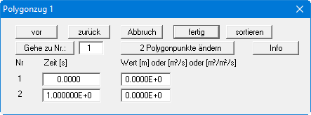Über den Knopf "2 Polygonpunkte ändern" bestimmen Sie die Anzahl der Aufpunkte des Polygonzuges. Sie haben die Möglichkeit, bis zu 100 Polygonpunkte zu definieren. Für Ihre Aufpunkte definieren Sie anschließend die Zeitabfolge mit dem zugehörigen Wert der Randbedingung. Achten Sie dabei auf die Dimensionen, die Sie verwenden. Wenn Sie die Durchlässigkeit in m/s eingegeben haben, dann müssen die Zeitwerte ebenfalls in Sekunden angegeben werden. Randbedingungen für Quellen sind dann in m³/s und Potentiale in m anzugeben. Im Beispiel wurden Sekunden angegeben. Bei der Auswertung hat es sich bewährt z.B. die Dimension für die Durchlässigkeit in m/Tag anzugeben, da Sie dann handlichere Zeiten erhalten. Grundsätzlich unterliegen Sie jedoch keinen Einschränkungen, da das Programm dimensionsecht arbeitet. Wenn Sie einen Polygonpunkt einfügen wollen, geben Sie diesen als zusätzlichen Wert am Ende der Tabelle ein und wählen anschließend den Schalter "sortieren".