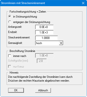 In der folgenden Dialogbox können Sie die Werte für die Berechnung und die Art der anschließenden Darstellung bestätigen oder verändern. Um den Weg eines Partikels rückzuverfolgen, aktivieren Sie den Schalter "entgegen der Strömungsrichtung".