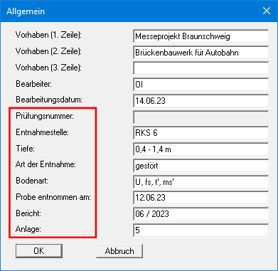 Nach Anwahl dieses Menüeintrags können Sie allgemeine Daten wie Bezeichnung des Vorhabens, Berichtnummer, Anlagennummer, usw. eingeben. Diese Daten werden in den dafür vorgesehenen Objekten des Ausgabeblattes dargestellt.