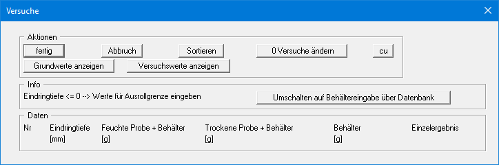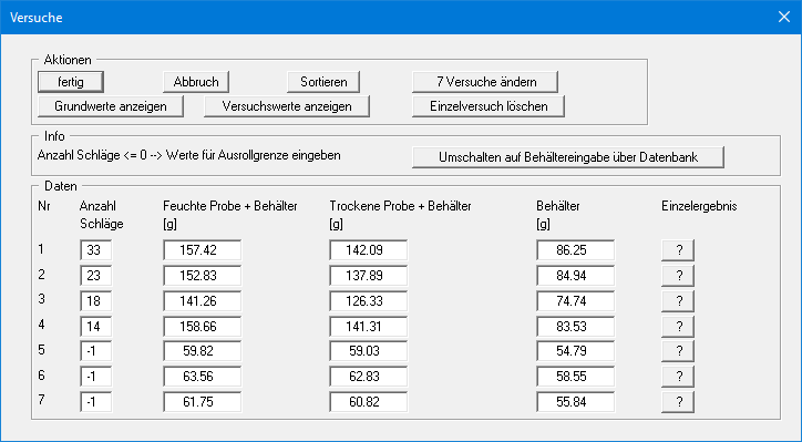 Im unteren Bereich "Daten" geben Sie für die von Ihnen angelegten Einzelversuche die Anzahl der Schläge sowie die Gewichte für Probe und Behälter zur Bestimmung des Wassergehaltes ein. Wenn Sie eine Schlagzahl von "0" oder einen negativen Wert vorgeben, kennzeichnen Sie damit, dass der Versuch der Ausrollgrenzen-Bestimmung dienen soll. Ansonsten werden die nachfolgenden Werte zur Bestimmung der Fließgrenze benutzt. Sie haben die Möglichkeit, das Gewicht des Versuchs-Behälters von Hand einzugeben oder aus einer Datenbank auszuwählen. Dazu steht Ihnen der Umschaltknopf "Umschalten auf Behältereingabe über Datenbank/Umschalten auf Behältereingabe "von Hand"" im darüberliegenden Bereich “Info” zur Verfügung.