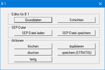 Die Erläuterungen zu den beiden oberen Knöpfen "Grunddaten" und "Schichten" finden Sie in den nachfolgenden Abschnitten. In der dargestellten Dialogbox können Sie folgende weitere Aktionen für das hier ausgewählte Schichtenverzeichnis B1 anstarten: