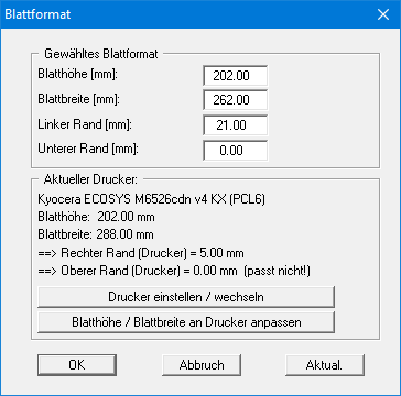 "Aktual.". Es werden dann die neuen Werte mit den Druckerwerten verglichen und das Ergebnis angezeigt. Sie können auch nur den linken und unteren Rand vorgeben und über den Knopf "Blatthöhe / Blattbreite an Drucker anpassen" die erforderlichen Größen vom Programm ermitteln lassen.