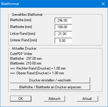 In der Dialogbox sehen Sie hinter dem Wert für den rechten Rand des Druckers die Anzeige "passt nicht!". Wenn Sie hier manuell die Einstellungen ändern, klicken Sie anschließend auf den Knopf "Aktual.". Es werden dann die neuen Werte mit den Druckerwerten verglichen und das Ergebnis angezeigt. Sie können auch nur den linken und unteren Rand vorgeben und über den Knopf "Blatthöhe / Blattbreite an Drucker anpassen" die erforderlichen Größen vom Programm ermitteln lassen.