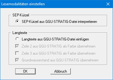 Um ein Höchstmaß an Importsicherheit zu erreichen, sollten die GGU-STRATIG-Dateien mit SEP-Kürzeln erzeugt werden. Wählen Sie dann für den Import den oberen Schalter "SEP-Kürzel aus GGU-STRATIG-Datei interpretieren".