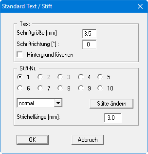 Alle Objekte werden mit dem aktuellen Zeichenstift gezeichnet. Insgesamt können Sie 10 verschiedene Stifte vorab definieren. Gehen Sie dazu in den Menüeintrag "Einstellen / Standard Text/Stift":