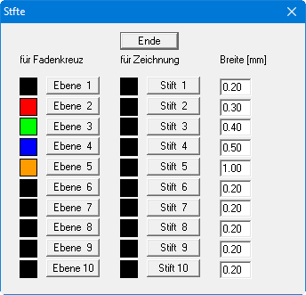 Falls Sie bei der Bearbeitung die Ebene wechseln, ändert sich die Farbe des Fadenkreuzes. Die Ebenenfarben können Sie mit den Knöpfen "Ebene 1", "Ebene 2" usw. ändern. Wenn Sie Ihre Zeichnung in mehreren Ebenen verwalten, ist die Unterscheidung Welches Objekt ist in welcher Ebene? schwierig. Um eine Darstellung der Zeichenobjekte (Linien und Texte) einer Ebene in den oben eingestellten Ebenenfarben zu erreichen, aktivieren Sie im Menüeintrag "Einstellen / Allgemein" den Schalter "Bildschirmdarstellung in Fadenkreuzfarben".