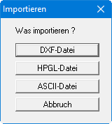 Es können drei unterschiedliche Formate importiert werden. Der Import erfolgt in die aktuelle Zeichnungsebene. Für die spätere Bearbeitung der importierten Daten ist es daher günstig, vor dem Import auf eine Ebene zu wechseln, die noch nicht mit Zeichnungselementen belegt ist.