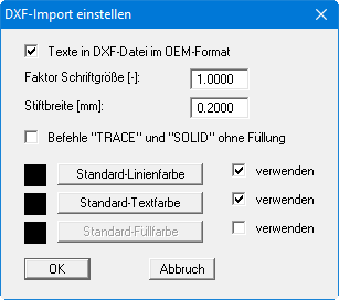 Wenn Sie beim Importieren der Schriften aus der DXF-Datei Probleme haben, z.B. dass die Umlaute nicht korrekt dargestellt werden, können Sie durch Ausschalten des Knopfes "Texte in DXF-Datei im OEM-Format" oder über den Schriftgrößen-Faktor eine bessere Darstellung erreichen. Sollen Farbfüllungen nicht übernommen werden, aktivieren Sie den Schalter "Befehle "TRACE" und "SOLID" ohne Füllung". Sollen farbige Linien oder Texte aus der DXF-Datei eingelesen werden, deaktivieren Sie die Schalter "verwenden" zu den entsprechenden Standards.