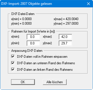 Wenn Sie Ihre Einstellungen in der obigen Dialogbox vorgenommen haben, klicken Sie auf den Knopf “OK”, damit die DXF-Daten so übernommen werden. Wenn Sie auf den Knopf "Alle löschen" klicken, werden die Daten aus der aktuell geladenen DXF-Datei nicht übernommen.