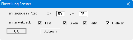 Das Programm verfügt über einen Menütitel "Fenster". Mit dem Begriff Fenster ist hier nicht ein WINDOWS-Fenster gemeint, sondern ein rechteckiger Bereich des Bildschirms, auf den Sie bestimmte Aktionen begrenzen können. Die voreingestellte Größe dieses Fensters können Sie im Menüeintrag "Fenster / einstellen" oder im Menüeintrag "Einstellen / Allgemein" verändern.