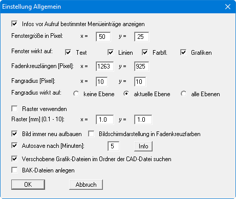 Sie können die Fensterwirkung bei Fensteroperationen einstellen. Wenn z.B. nur die Box "Text" aktiviert ist, wirken alle Fensteroperationen (wie z.B. "Fenster löschen") nur auf Texte. Linien werden dann nicht gelöscht. Diese Einstellung ist ebenfalls über den Popup-Dialog möglich, das Sie durch Drücken der rechten Maustaste auf dem Bildschirm erhalten."Fadenkreuzlängen [Pixel]"