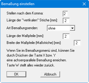 Das Programm ermöglicht auch die Bemaßung Ihrer Zeichnung. In diesem Menüeintrag nehmen Sie die Grundeinstellungen für das Bemaßen vor. Es erscheint folgende Box:
